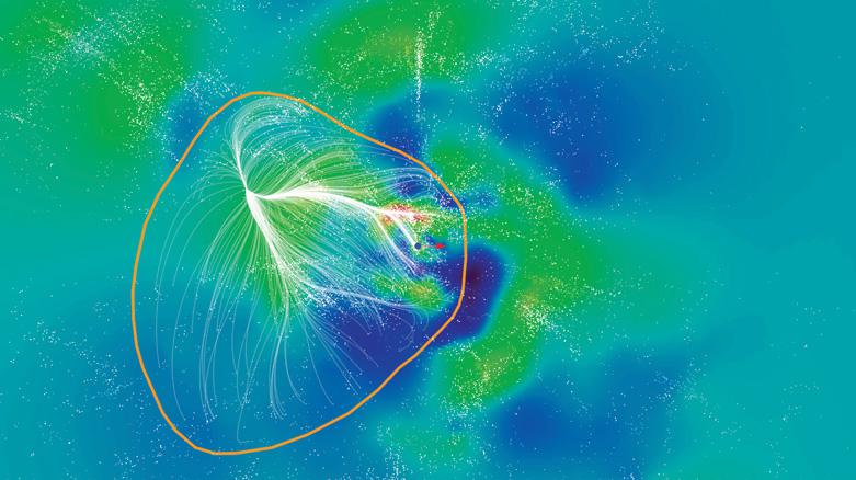 Se trata de una vasta red de galaxias vecinas o supercúmulo que forma una espectacular red de estrellas y planetas que se extiende por 520 millones de años luz y 100.000 billones de estrellas. Hablamos de un lugar en el que la Vía Láctea, con sus 200.000 millones de estrellas y sus 100.000 años luz de diámetro, pasa completamente desapercibida. La investigación, publicada en Nature, la ha liderado un equipo de investigadores liderado por el astrónomo Brent Tully, de la Universidad de Hawái (EEUU). En la imagen, Laniakea. En el punto rojo se encuentra la Tierra.