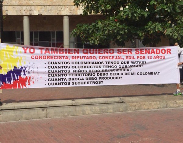 Todavía no sé si reír o llorar con estos uribistas. Esta pancarta resume la ignorancia y desinformación de quienes alaban a su mesías, el doctor Álvaro Uribe, y quienes salieron hoy –con poncho y sombrero– a marchar por las principales calles del país: