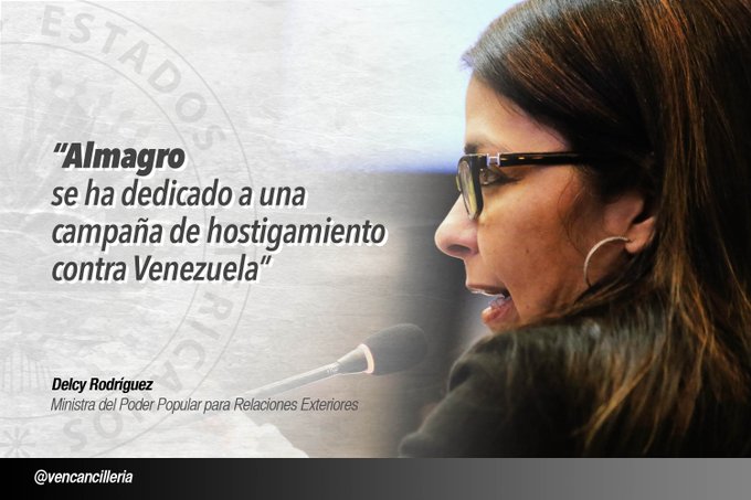 Rodríguez presentó pruebas contundentes de todas los ataques verbales de Almagro contra Venezuela, "quien se ha dedicado a hostigar al Gobierno legítimo" a través de redes sociales y declaraciones a medios noticiosos.