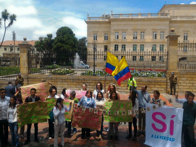 En un encuentro entre el presidente Juan Manuel Santos y el senador de derecha Álvaro Uribe en Casa de Nariño en Bogotá, un grupo de manifestantes también mostró su apoyo a la opción del Sí.