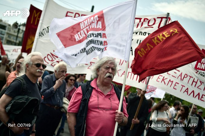 En Grecia, miles de trabajadores del sector público se congregaron en el exterior del Parlamento en defensa de sus derechos y para protestar contra los próximos recortes de gasto que incluyen nuevas rebajas en las pensiones y un alza de los impuestos.