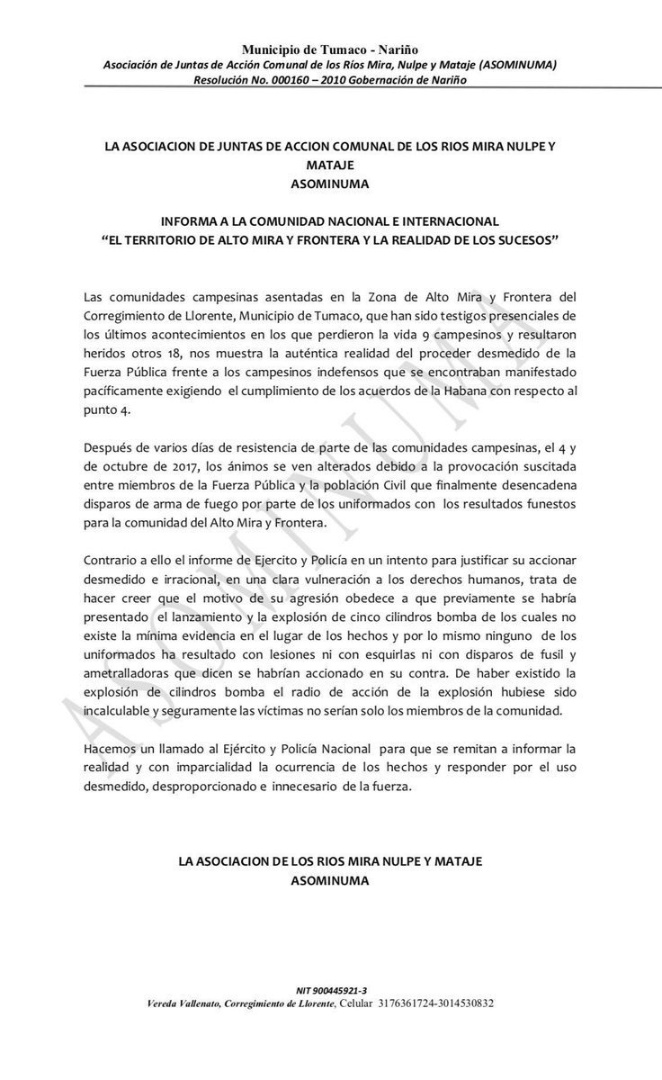 Las comunidades campesinas asentadas en la Zona de Alto Mira y Frontera del Corregimiento de Llorente, Municipio de Tumaco, que han sido testigos presenciales de los últimos acontecimientos en los que perdieron la vida 9 campesinos y resultaron heridos otros 18, nos muestra la auténtica realidad del proceder desmedido de la Fuerza Pública frente a los campesinos indefensos que se encontraban manifestado pacíficamente exigiendo el cumplimiento de los acuerdos de la Habana con respecto al punto 4.