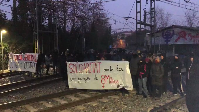 La circulació està aturada i els manifestants criden ‘Llibertat presos polítics’ i ‘Vaga general’. Pancartes amb proclames com ‘Jutgem l’Estat’ i ‘Solidaritat amb les companyes de @8MilMotius ‘ #vaga21febrer #VagaGeneral21F #SantCugat @FGC