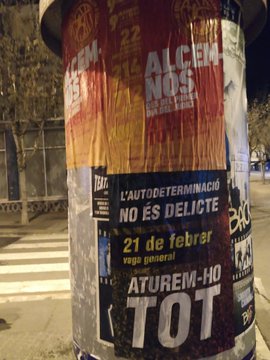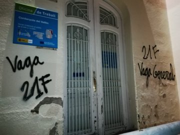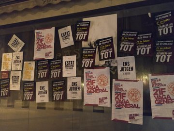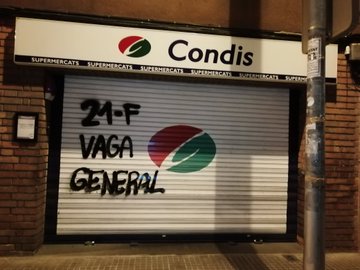 La acción de los llamados 'piquetes informativos' también ha sido intensa desde la madrugada en todo el territorio catalán. Mediante carteles, pegatinas, pintadas y mensajes en las redes sociales han animado a la ciudadanía a secundar la huelga, con lemas como 'paralicémoslo todo', o 'no trabajes, no produzcas, no consumas'.