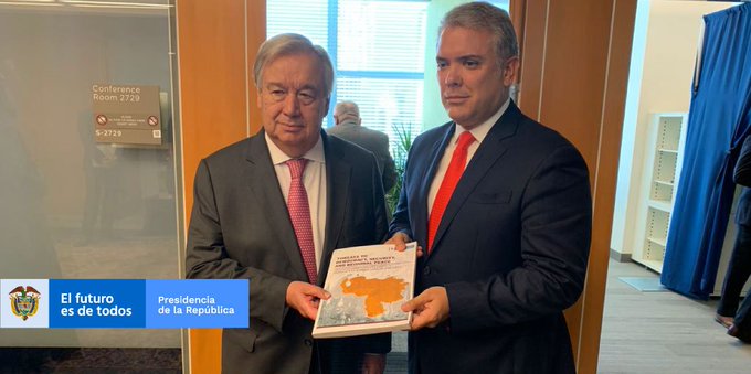Duque presentó al secretario general de la ONU, António Guterres, un informe para tratar de acusar a Venezuela de ofrecer amparo a "los grupos terroristas" del Ejército de Liberación Nacional y de las disidencias armadas de las extintas Fuerzas Armadas Revolucionarias de Colombia (FARC).