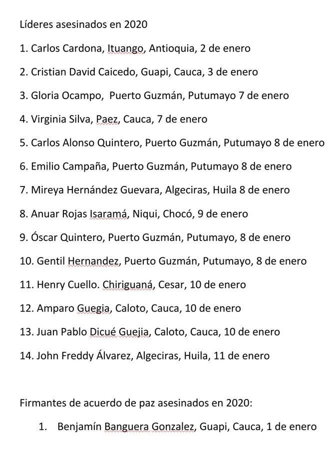 Al respecto, el coordinador del observatorio de conflictos y derechos humanos de la organización colombiana Indepaz declaró que estos homicidios persiguen frenar a los movimientos sociales y su defensa de los territorios. En su cuenta de Twitter precisa que desde principios de año murieron 14 activistas.