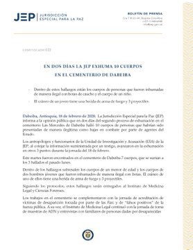 Estas afirmaciones del militar coinciden con las exhumaciones de 10 víctimas de ejecuciones extrajudiciales, entre ellas un niño de entre 7 y 10 años, en fosas comunes en el Cementerio Católico Las Mercedes de Dabeiba, en el departamento Antioquia, al noreste del país suramericano, donde habría unos 50 cuerpos, según información que maneja la Jurisdicción Especial para la Paz (JEP).