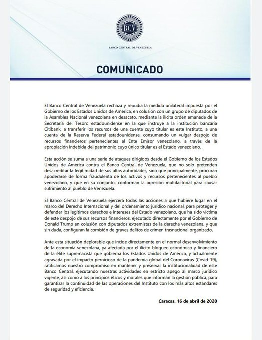 El Banco Central de Venezuela rechaza y repudia la medida unilateral impuesta por el Gobierno de los Estados Unidos de América, en colusión con un grupo de diputados de la Asamblea Nacional venezolana en desacato, mediante la ilícita orden emanada de la Secretaría del Tesoro estadounidense en la que instruye a la institución bancaria Citibank, a transferir los recursos de una cuenta cuyo titular es este Instituto, a una cuenta de la Reserva Federal estadounidense, consumando un vulgar despojo de recursos financieros pertenecientes al Ente Emisor venezolano, a través de la apropiación indebida del patrimonio cuyo único titular es el Estado venezolano.
