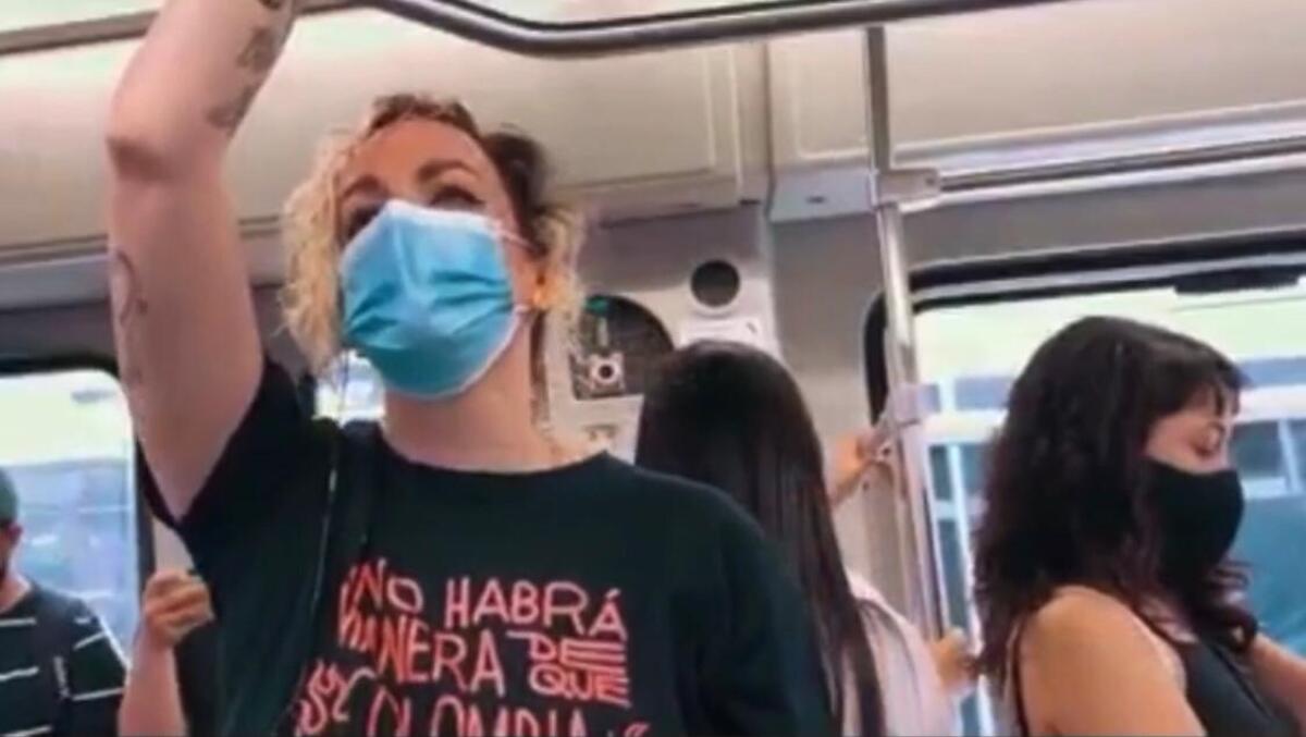 En uno de los vagones, las artistas comenzaron a cantar una canción alusiva al paro nacional, a la violencia en el país y a la respuesta o manejo que para ellas le ha dado el gobierno a la situación.