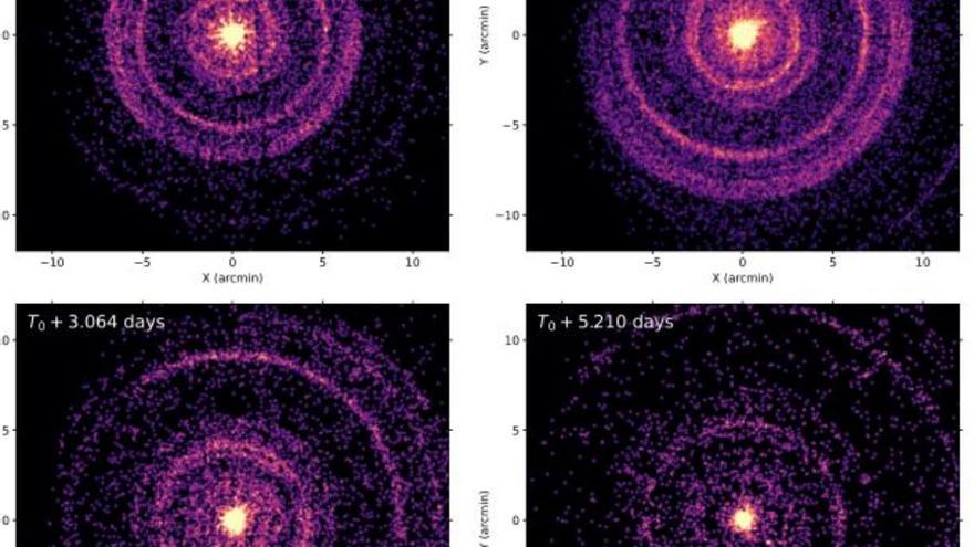 La luz hace eco del estallido de rayos gamma, avanzando hacia nosotros y produciendo un efecto de "anillo en expansión", según los científicos. /CRÉDITOS: WILLIAMS ET AL., ARXIV, 2023.