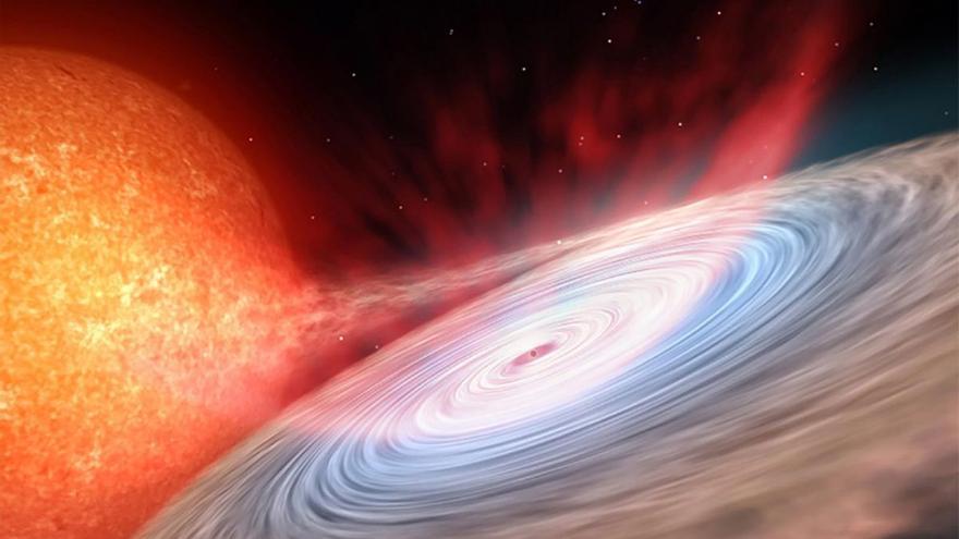 Representación artística de una estrella de neutrones acumulando materia desde la envoltura de su compañera. /CRÉDITO: GABRIEL PÉREZ DÍAZ, SMM (IAC).