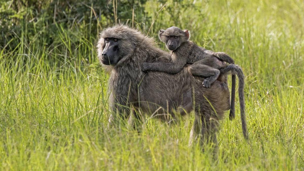 Papión oliva (Papio anubis) con cría, Parque Nacional de la Reina Isabel, Uganda. WIKIPEDIA COMMONS