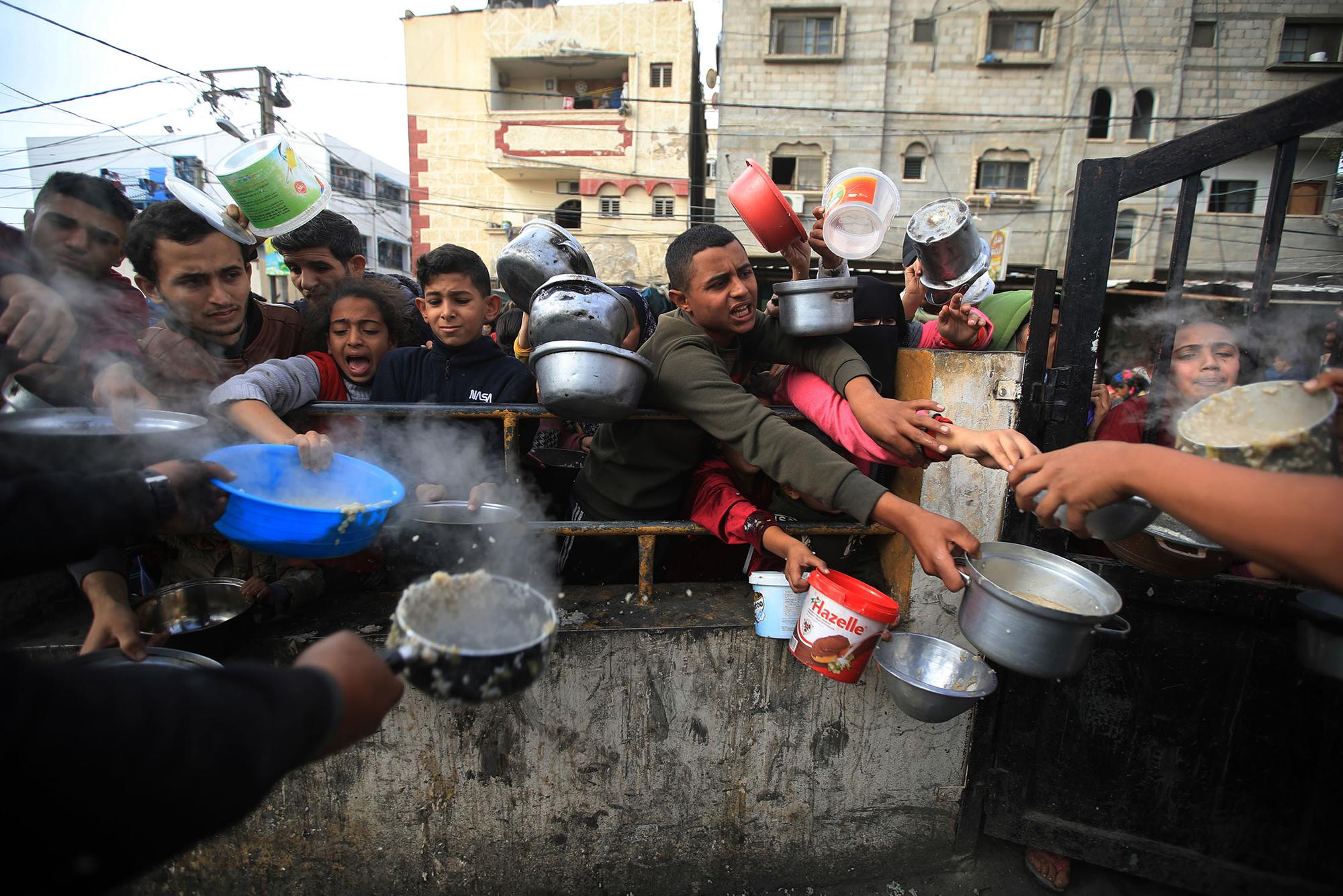 Palestinos hacen cola para una comida preparada por voluntarios en Rafah. Según un informe de la ONU, los 2,3 millones de habitantes de Gaza están en alto riesgo de hambruna. MOHAMMED ZAANOUN/ ACTIVESTILLS (©)