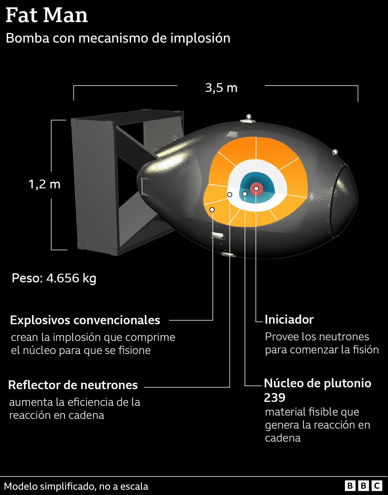 Fat Man tenía una carga de 6 kilos de plutonio, pero se calcula que solo logró fisionarse 1 kilo.