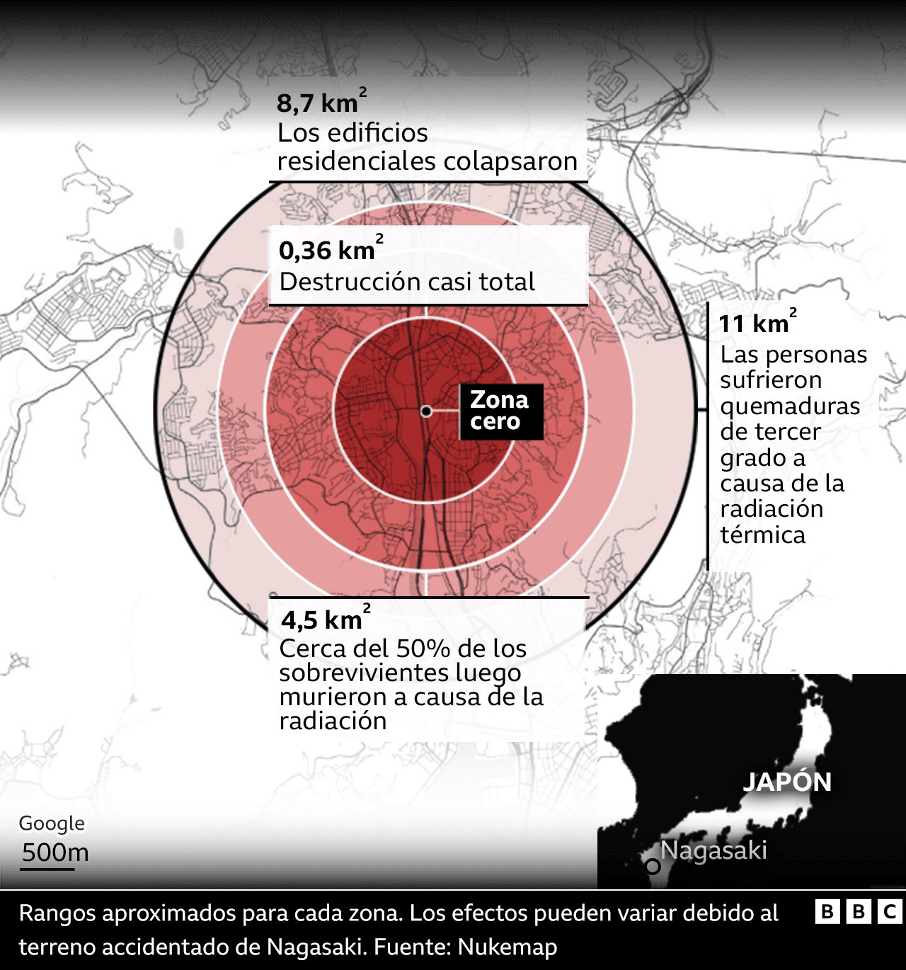 En Nagasaki la bomba destruyó un área de 7,7 km2 . Cerca del 40% de la ciudad quedó en ruinas.