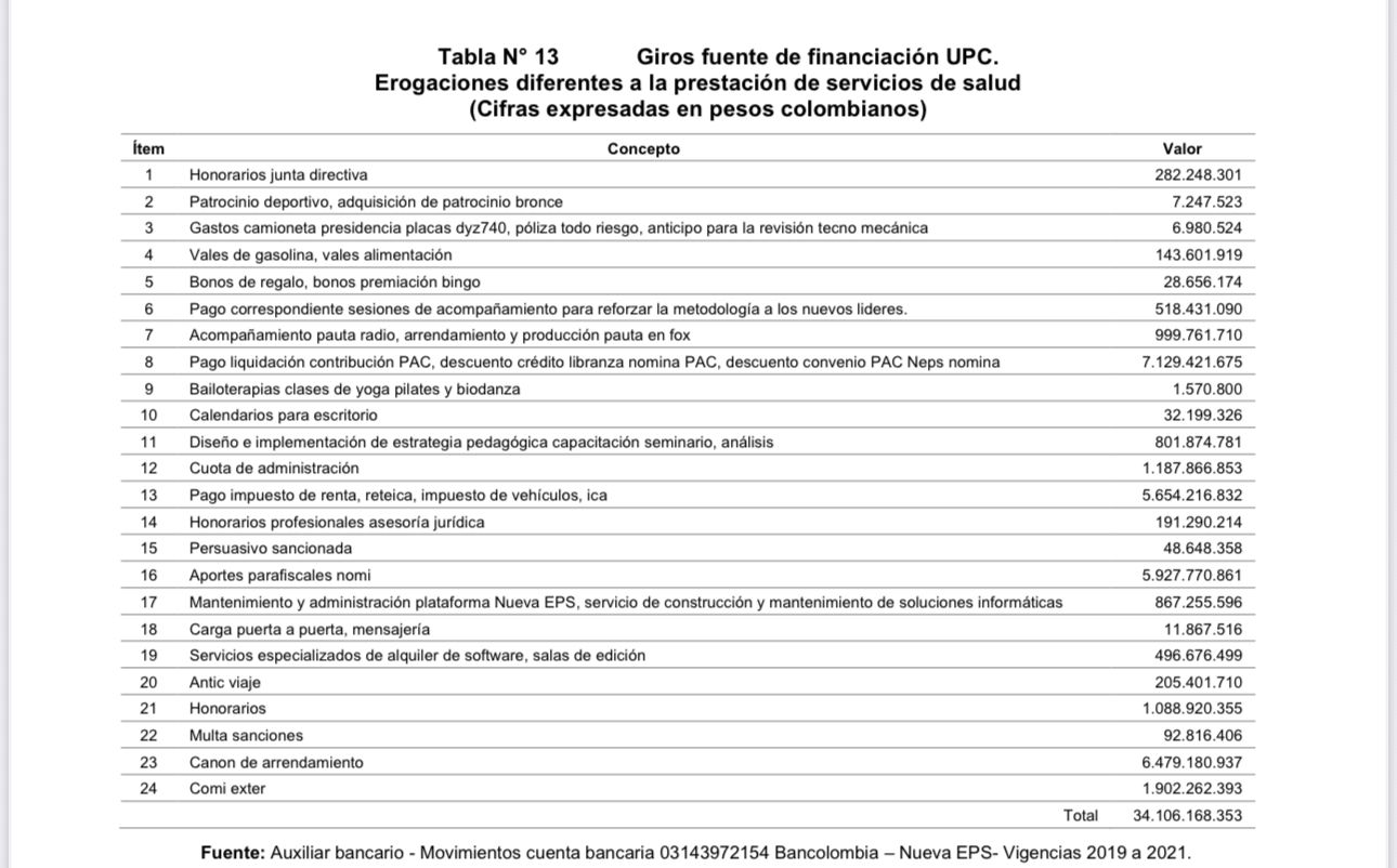 Captura de pantalla del informe de la Contraloría sobre los gastos de las Nueva EPS