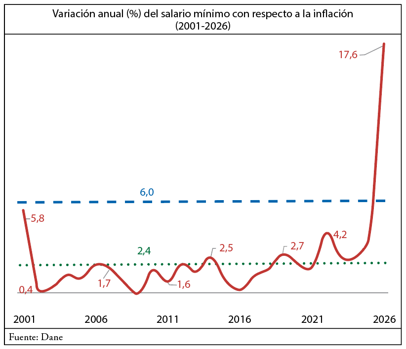 Tal y como se observa en la figura, en los últimos 25 años el salario mínimo estaba subiendo más que la inflación. El promedio había sido 2,4 puntos por encima (línea punteada inferior). En todos los años, el poder de compra iba mejorando de manera progresiva. El salario para 2026 es 17,6 puntos por encima de la inflación de noviembre del 2025. Este salto no tiene precedentes.