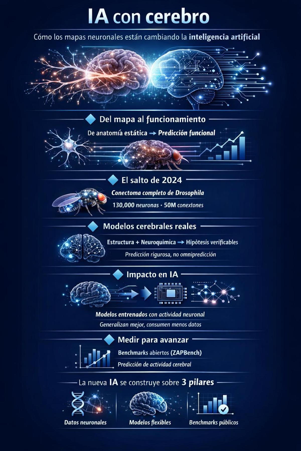 Con todos estos desarrollos estamos construyendo un puente hacia una nueva generación de inteligencia artificial más eficiente. Ese puente toma al cerebro como referencia doble: como fuente de datos y estructura (conectomas y actividad neuronal) y como patrón de eficiencia que intentamos emular.