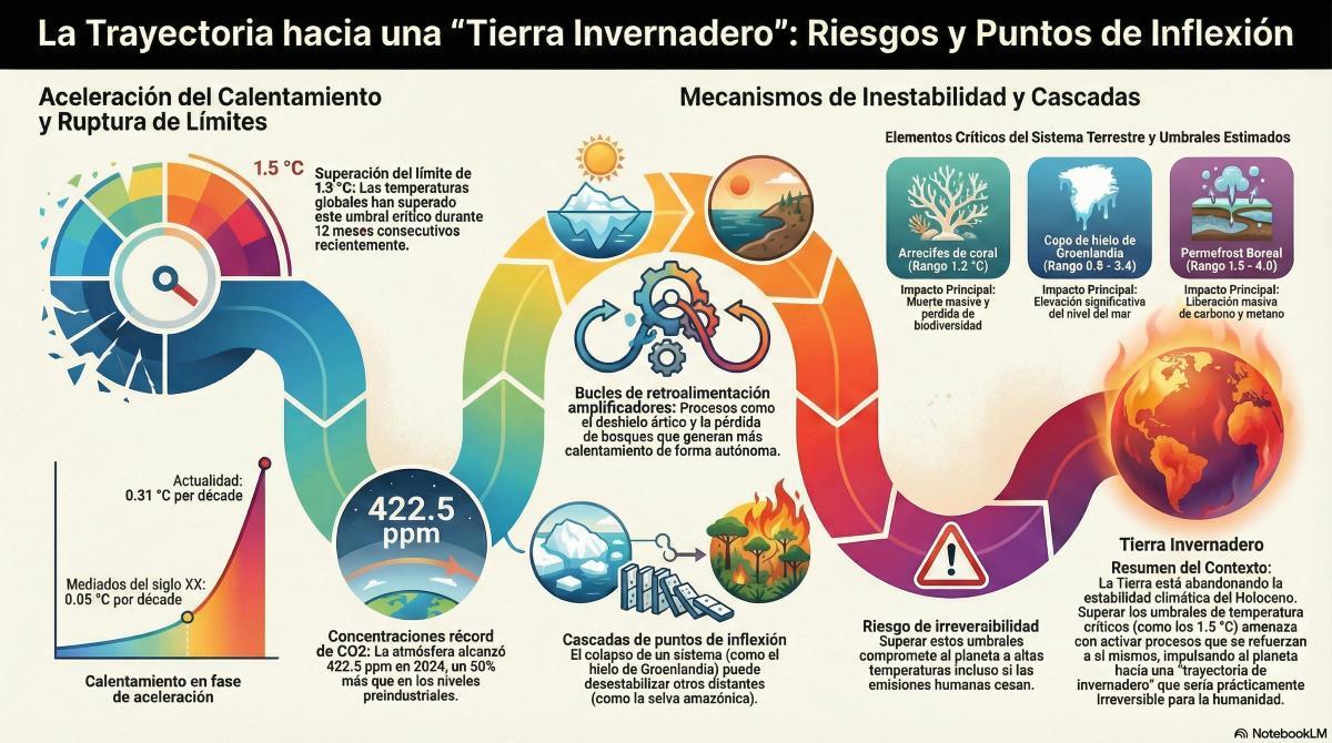 Nuestro planeta está abandonando las condiciones estables que durante milenios permitieron el desarrollo de la civilización humana. El peligro es activar interruptores internos del planeta —como el colapso de los hielos o la selva— que aceleren el calentamiento por su cuenta. Los científicos lo llaman "trayectoria de invernadero", un camino del que sería muy difícil regresar.